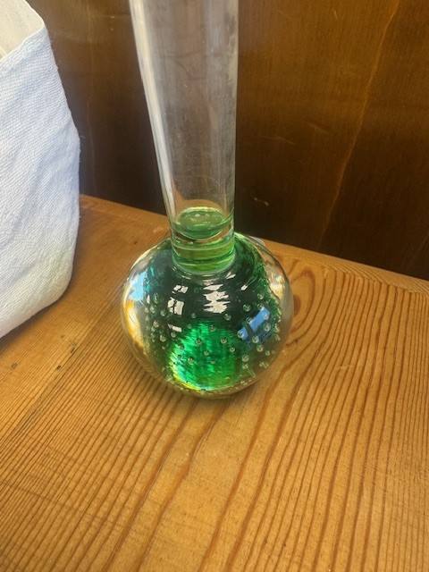 Orkidevasen er grøn med luftbobler i foden.
