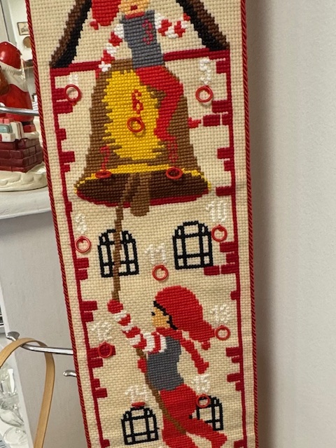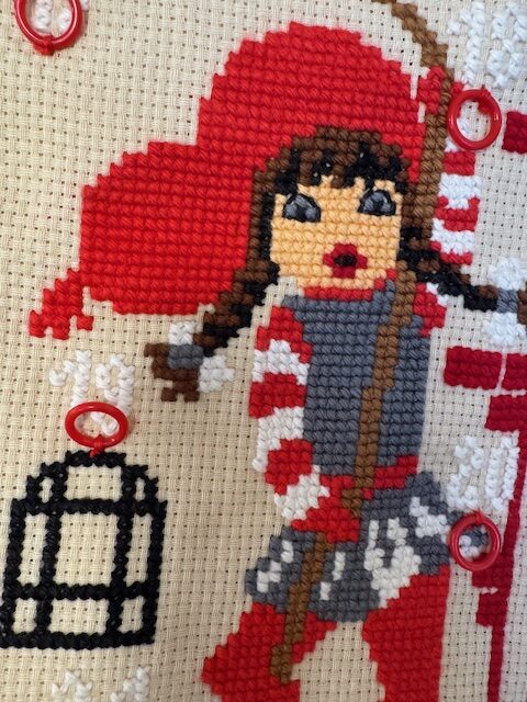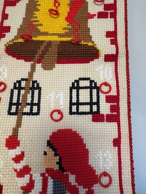 Kalenderen har 24 røde ringe, hvor pakkerne kan bindes fast.